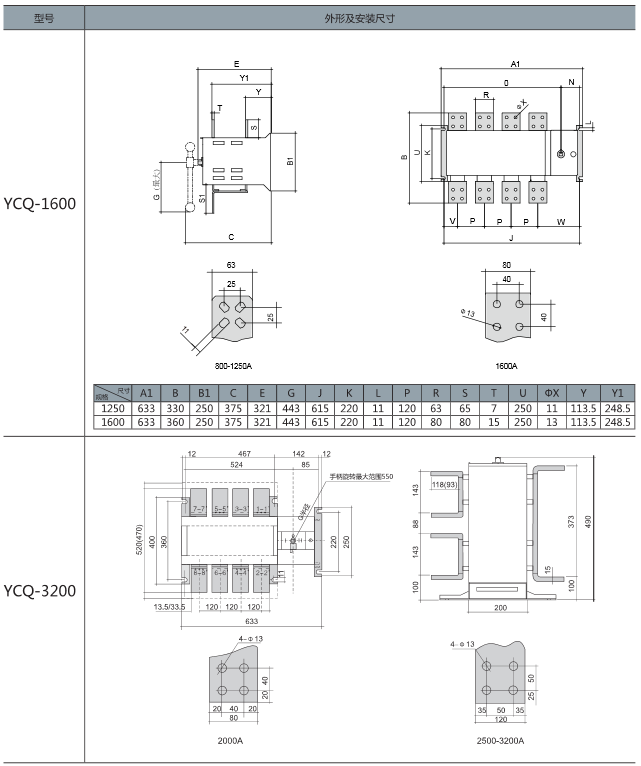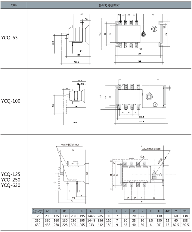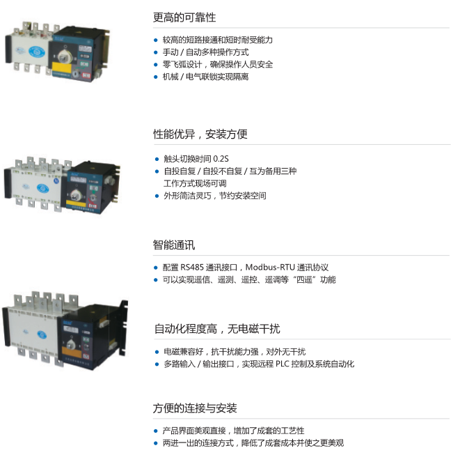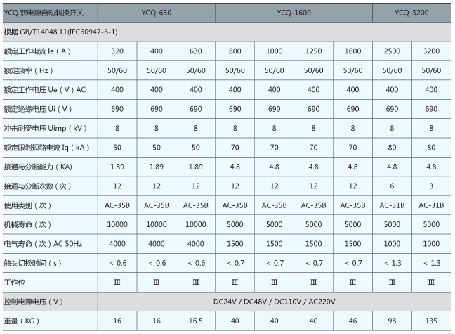 YCQ系列雙電源自動轉換開關適用于額定絕緣電壓690V、額定功率50HZ、額定工作電壓400V及以下、額定電流10A~3200A的配電系統中。主要用于供電系統在應急情況下的雙路電源轉換,最小轉換動作時間小于0.2S,以確保主要負荷(應急照明、應急樓梯、消防系統等)連續可靠工作。廣泛應用于高層樓宇、郵電通訊、工礦企業、船舶運輸、電力站、醫院、銀行等需要提供不間斷供電的重要場所。