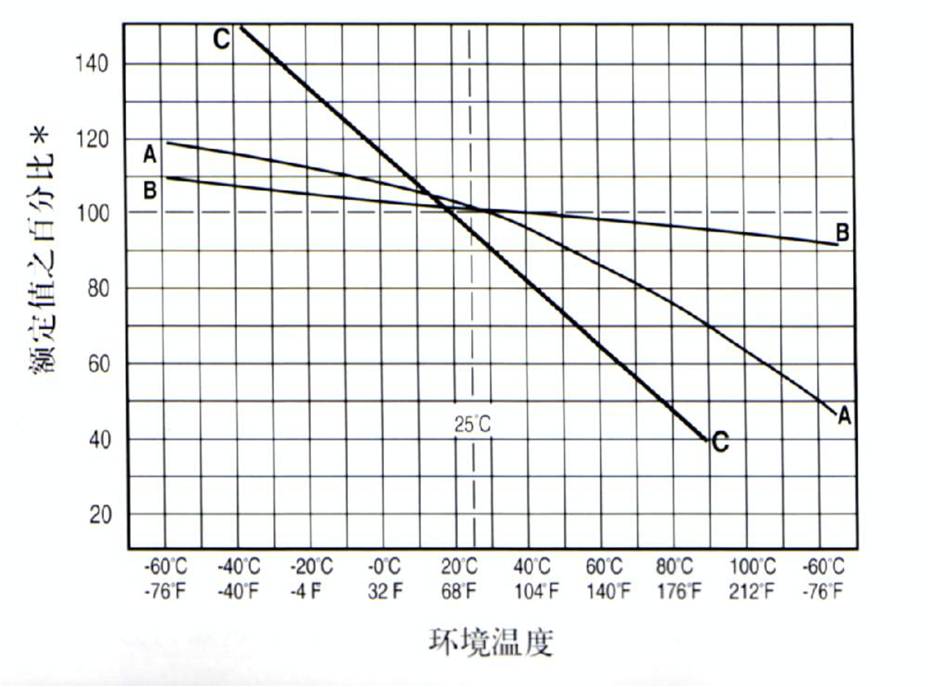 保險絲所處小環境溫度或已知的工作溫度, 對保險絲的動作是有影響的環境溫度越高, 保險絲的工作時就越熱, 其壽命也就越短不管是 UL 規格還是 IEC規格, 保險絲的各項指標都是指在25 0C ,如小環境工作溫度較高,則要考慮保險絲的溫度折減率(見下圖)。
