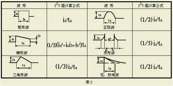 原則: 選用熔斷器時必須考慮 If2t > Ir2t, 即熔斷器的熔化熱能應大于浪涌電流釋放的熱能 幾種典型波形的I2t 計算方法(見下圖)