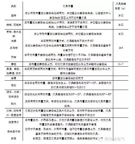 (3)光源和燈具。在體育館頂棚高的比賽場(chǎng)地上所用光源,宜采用高效率、長(zhǎng)壽命、大光通量的金屬鹵化物燈或LED燈。對(duì)于頂棚較低,規(guī)模小的練習(xí)場(chǎng)地則宜采用配有電子鎮(zhèn)流器的熒光燈、小型金鹵燈、LED燈、無(wú)極燈等。