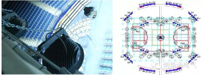 美國(guó)圣母大學(xué)(University of Notre Dame)位于美國(guó)印第安那州,是世界頂尖的高等學(xué)府,創(chuàng)建于1842年。其體育館是全美大學(xué)生聯(lián)賽的主要賽場(chǎng)之一,達(dá)到我國(guó)甲級(jí)體育建筑標(biāo)準(zhǔn)。2013年,該體育館對(duì)場(chǎng)地照明系統(tǒng)進(jìn)行改造,用LED燈替換原有金鹵燈,共采用Musco公司的605W LED燈具80套,130W LED燈8套,滿足高清電視轉(zhuǎn)播要求,平均垂直照度達(dá)1850lx,場(chǎng)地照明系統(tǒng)總的安裝功率僅為49.44kW,比原有金鹵燈系統(tǒng)減少73%,預(yù)計(jì)十年運(yùn)行、維護(hù)成本可節(jié)省220余萬(wàn)元人民幣(廠家承諾十年質(zhì)保)。圖3為體育館燈具布置圖,及燈具細(xì)部。很明顯它是多功能體育館,筆者參觀時(shí)即將舉行開(kāi)學(xué)典禮,場(chǎng)地由籃球場(chǎng)轉(zhuǎn)換成會(huì)場(chǎng)。燈具安裝在馬道上,方便安裝、調(diào)試,燈具散熱系統(tǒng)依稀可見(jiàn),保證了照明系統(tǒng)的長(zhǎng)壽命,正因?yàn)榇耍瑥S家承諾十年質(zhì)保,這在中國(guó)市場(chǎng)恐怕獨(dú)此一家。圖中金屬鏈條是防跌落系統(tǒng),高空中如果有金屬部件不慎跌落,有可能釀成悲劇。燈具布置圖中藍(lán)色圓點(diǎn)為605W燈具,紅點(diǎn)為130W燈具。