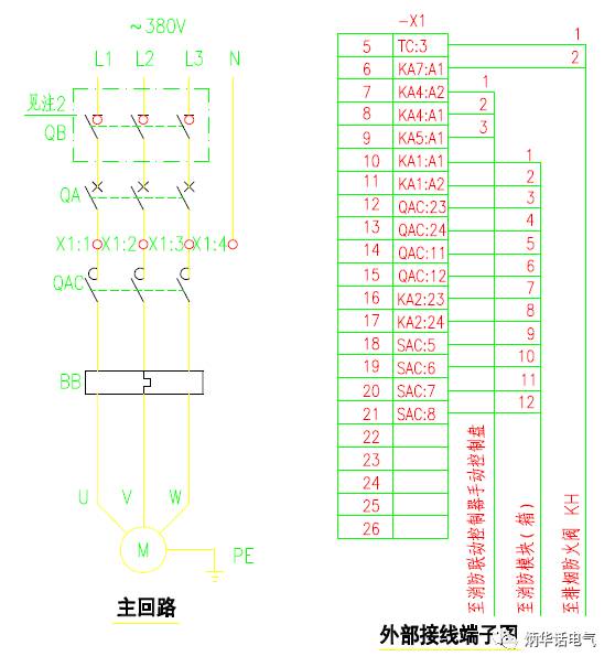 控制線路b有12芯線,分別為2芯消防自動控制(KA1,通過消防控制模塊),4芯反饋風機運行狀態(tài)(QAC),2芯過負荷信號(KA2),手自動轉換開關位置狀態(tài)(SAC)。