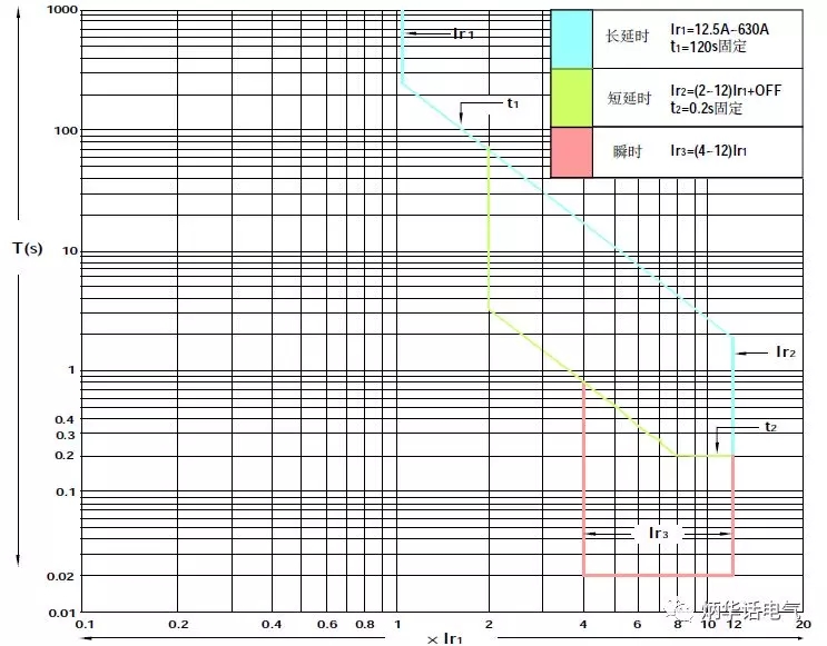 如圖1所示為典型的兩段式保護特性曲線。左側曲線為反時限的過載保護特性曲線;右側為直線,表示定時間的瞬時動作曲線,動作時間為0.02s。而圖2為某斷路器三段式保護特性曲線。
